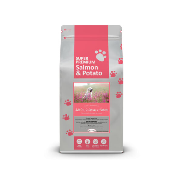Salmone (36,5%, di cui 24% di salmone e 12,5% di farina di salmone), patate (26%), avena, granoturco, zucchero da polpa di barbabietola, grasso di carni bianche, salmone idrolizzato, olio di salmone, minerali, vitamine.